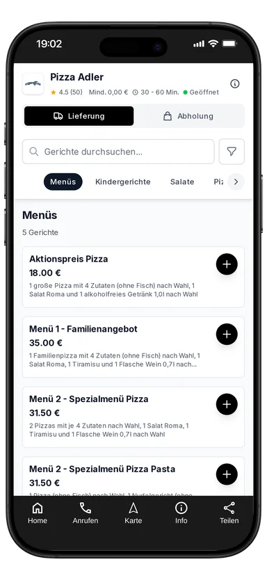 1 Pizza (ohne Fisch) nach Wahl, 1 Nudelgericht (ohne Fisch) nach Wahl, 1 Salat Roma, 1 Tiramisu und 1 Flasche Wein 0,7l nach Wahl